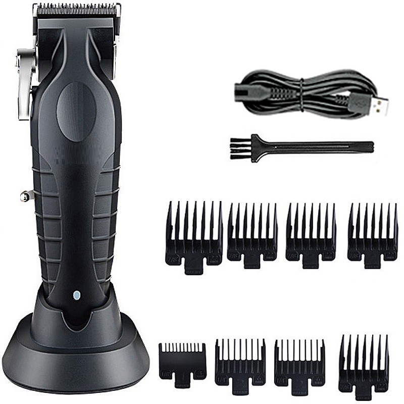 Powerful wireless trimmer with 8 attachments (3/6/10/13/16/19/22/25 mm) and charging stand, perfect for precise hair and beard styling. Full description