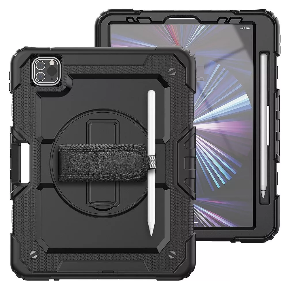 Are you looking for a case that will adequately protect your Apple iPad Pro 12.9" (2021)? This case guarantees the safety of your device. The inner hard polycarbonate, with an outer soft silicone cover, offers maximum protection. There is a space on the back for placing the Apple Pencil. It is equipped with a 360° rotating built-in stand. You can easily attach your hand to the stand using the fastening straps.