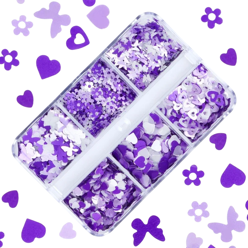 Shiny purple sequins in various shapes for creative use in nail decoration, sewing, scrapbooking, DIY projects, and decorations. Full description