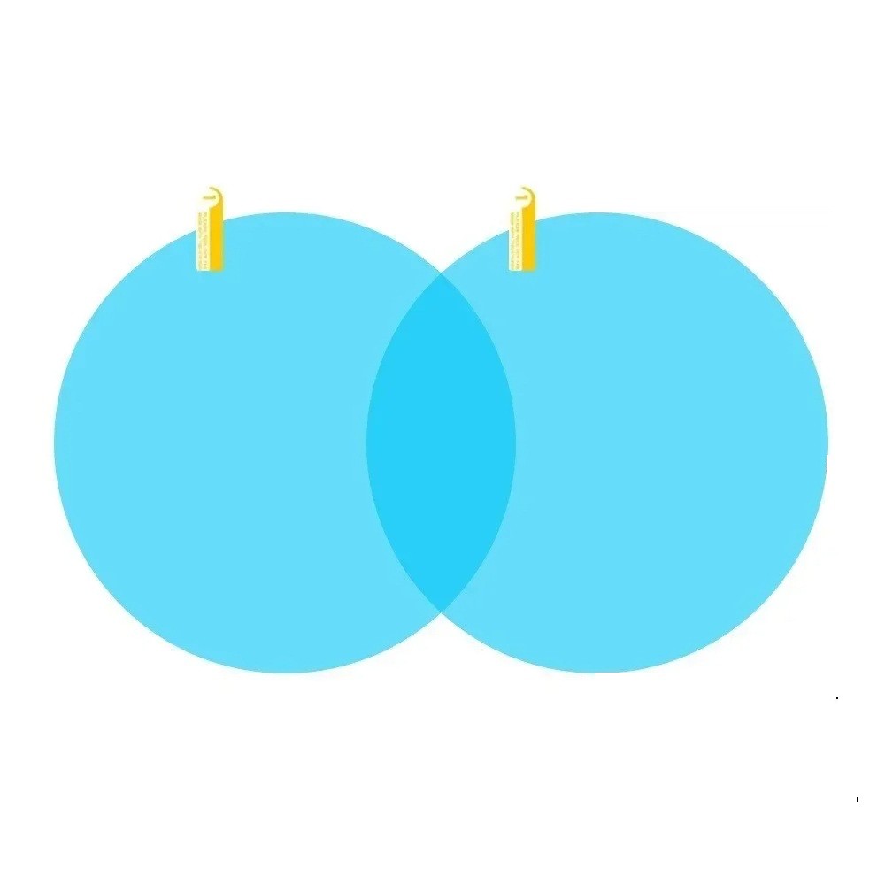 Round film with easy installation for wing mirrors. Repels water, fog, and dirt, ensuring a clear view while driving in rain or fog. Full description