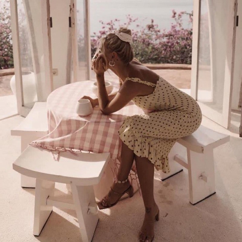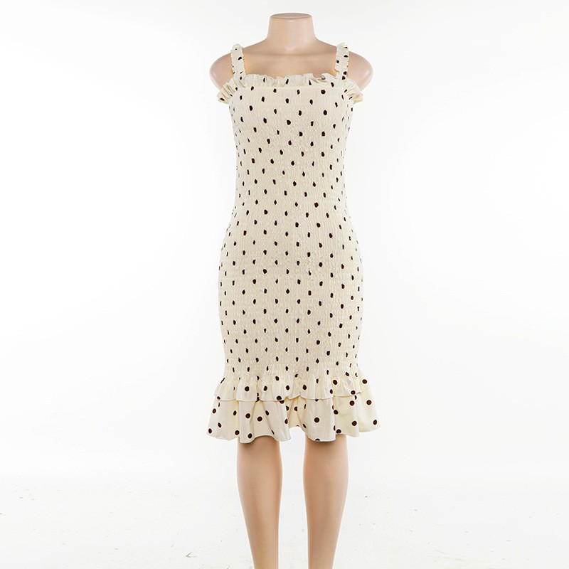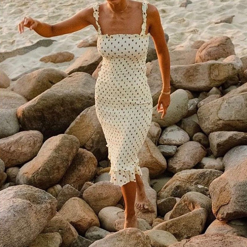 The hems of the dress and the straps are adorned with ruffles.