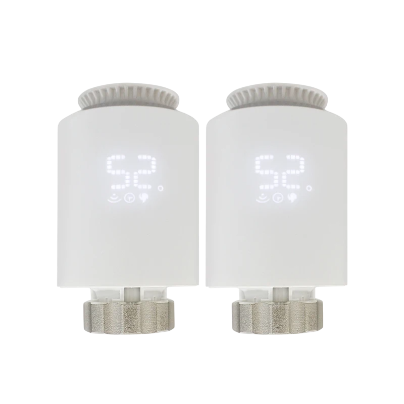 Two smart valves with ZigBee support, app and voice control. Suitable for group temperature control in a smart home with scheduling. Full description