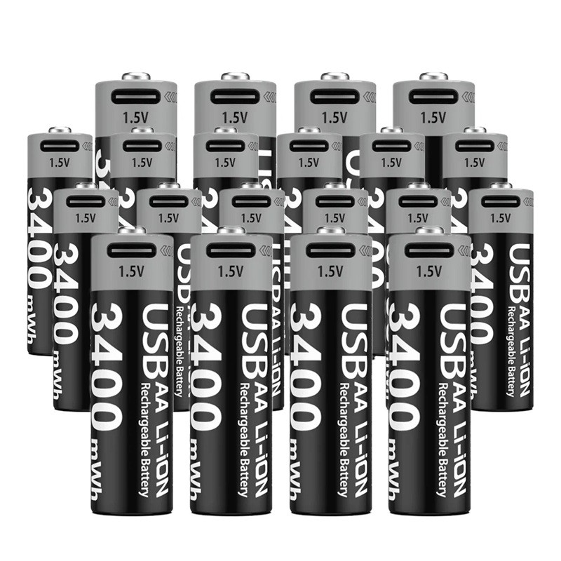 Set of 20 Rechargeable AA Batteries 3400mWh Lithium-Ion 14.5x50.5 mm USB-C Charging Eco-Friendly Replacement Reusable Long Life