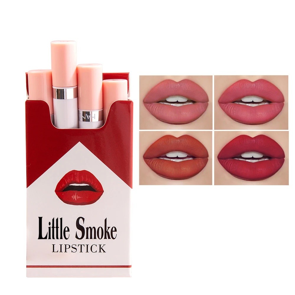 Contents: 4× matte waterproof lipstick in a cigarette-shaped box