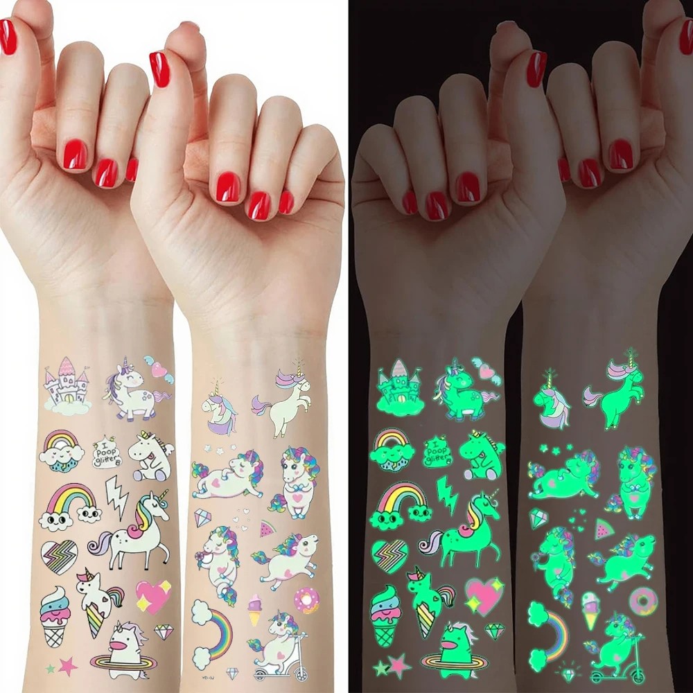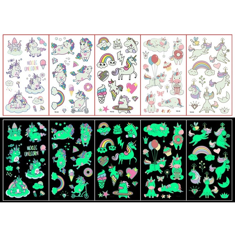 - Contents: 1x set (5 sheets of glow-in-the-dark unicorn tattoos).