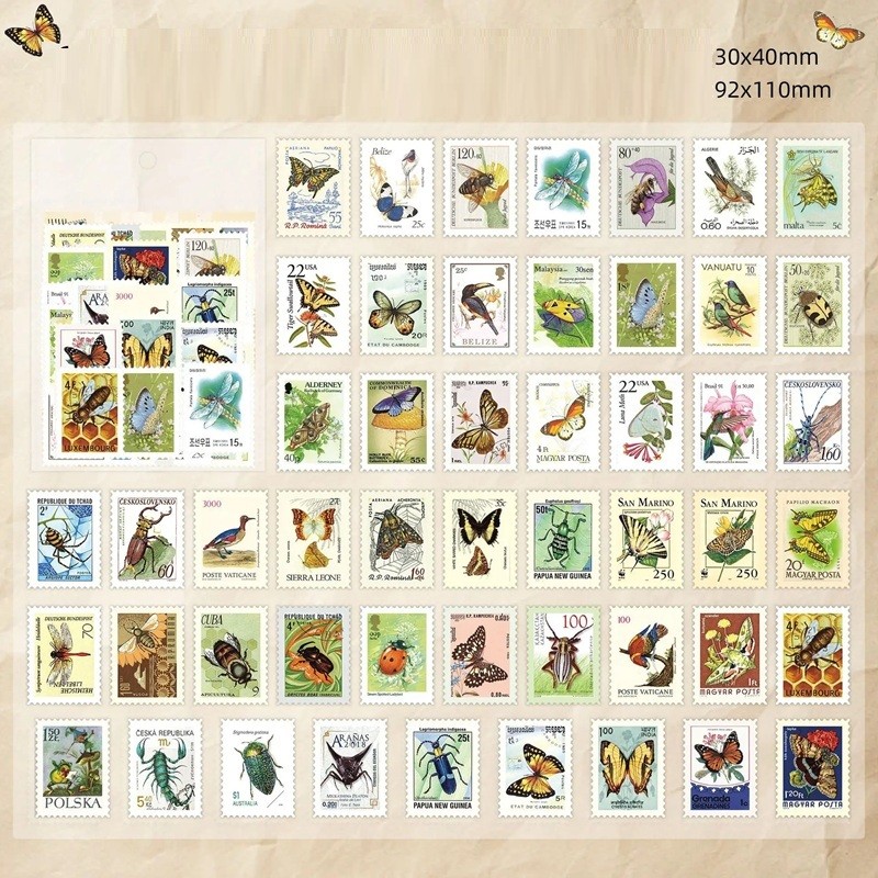 Set of 50 Insect-Themed Stamp-Shaped Stickers 30x40 mm for Decorations and Creative Projects