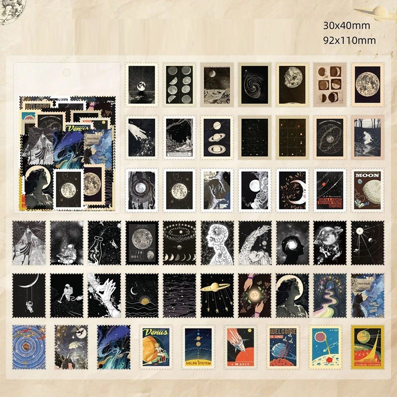 This set contains 50 stamp-shaped stickers featuring space motifs, such as planets, the Moon, and starry objects. Although they are not intended for collectors of actual postage stamps, they are perfect for creative crafting and decoration. The stickers are shaped like stamps and are ideal for use in journals, albums, collages, or other artistic projects.