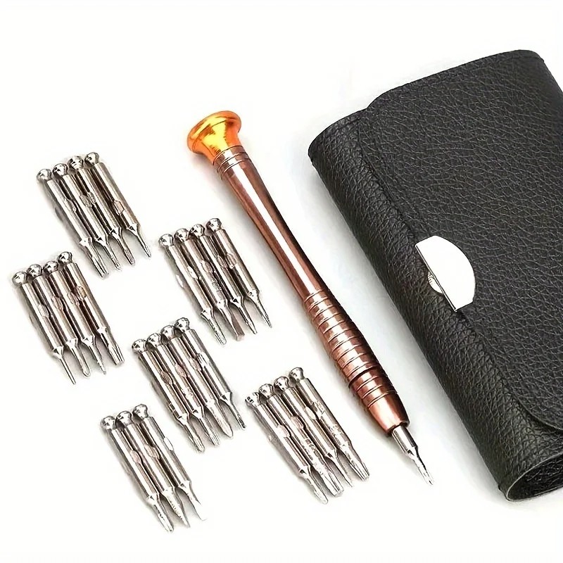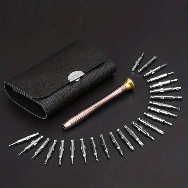 Home page Home page Hobbies & Garden Tools Hand Tools Watch Repair Tools Set of Precision Screwdrivers in Leather Case 24 Attachments + Aluminium Handle Compact Tool for Watch and Fine Electronics Repair
