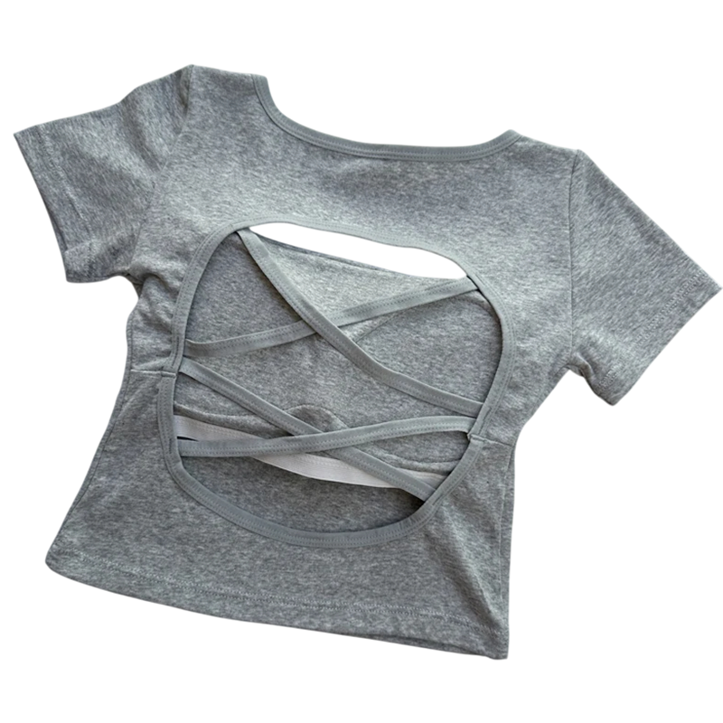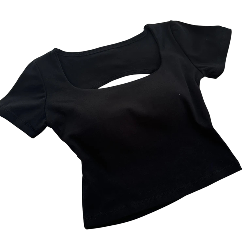 Home page Home page Clothing & Accessories Women’s Clothing Women’s T-Shirts & Tops Women’s Short Sleeve T-Shirts & Tops Short Women's T-Shirt with Back Cut-Out Decorative Straps Elastic T-Shirt with Cut-Out Elegant Top with Short Sleeves