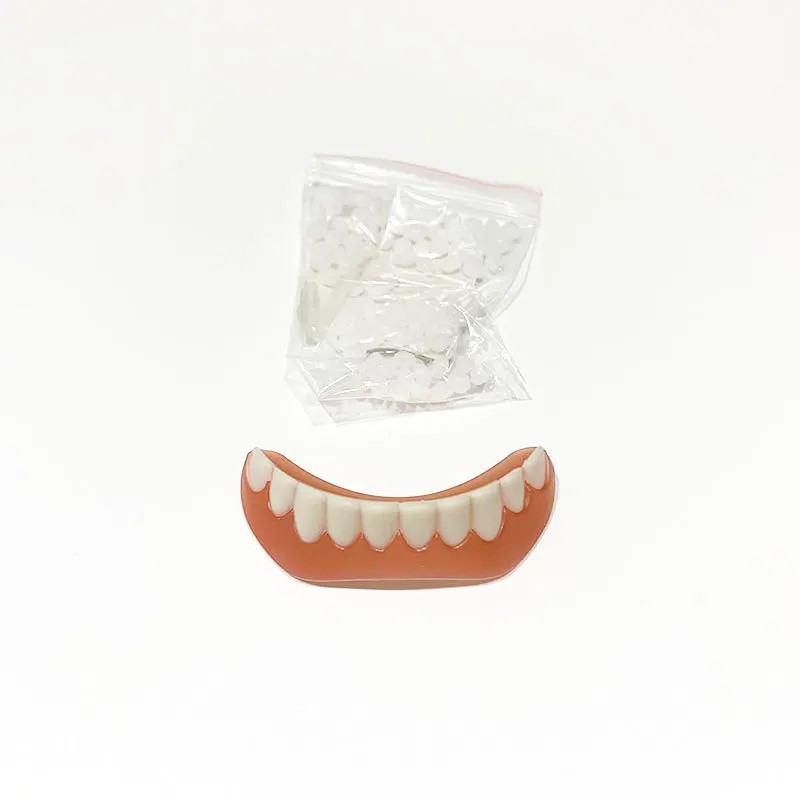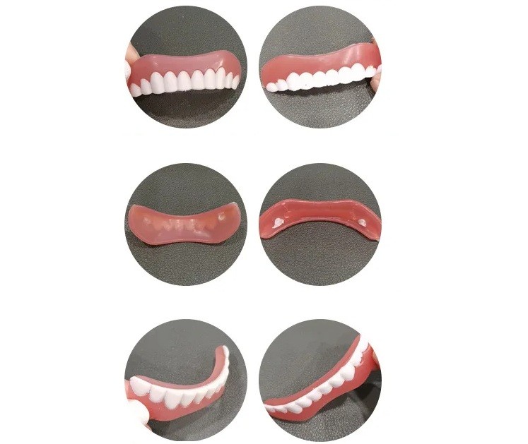 Practical silicone denture set for upper and lower teeth. Natural appearance, comfortable wear, easy application and reusable. Full description