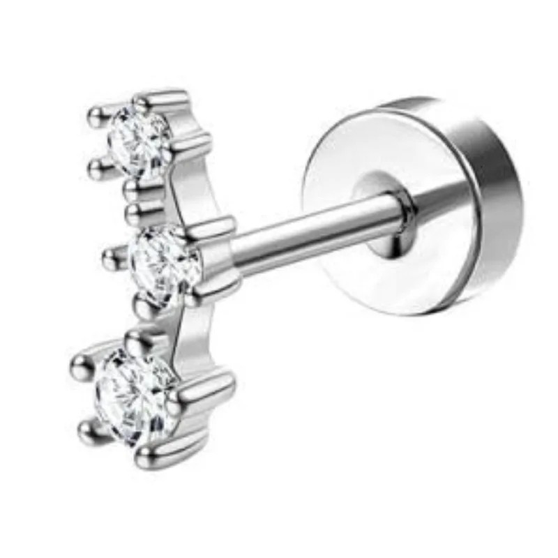 Silver piercing with a trio of stones in a line made of surgical stainless steel, suitable for sensitive ears, designed for everyday wear. Full description