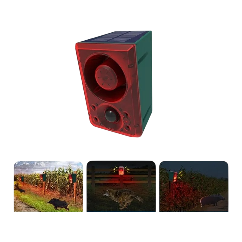 The solar animal repeller is a device designed for outdoor use, such as in gardens or properties. It combines a sound alarm, flashing light, and motion sensor that can respond to movement in the monitored area.
