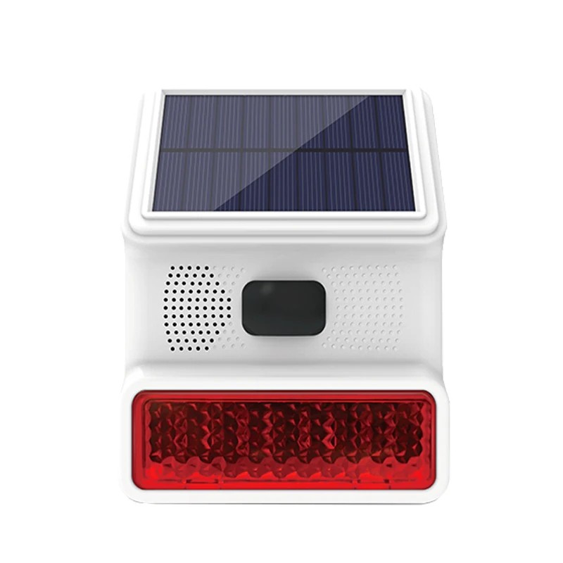 Wireless solar siren with loud sound and warning light for outdoor security of properties, compatible with 433MHz alarm systems. Full description