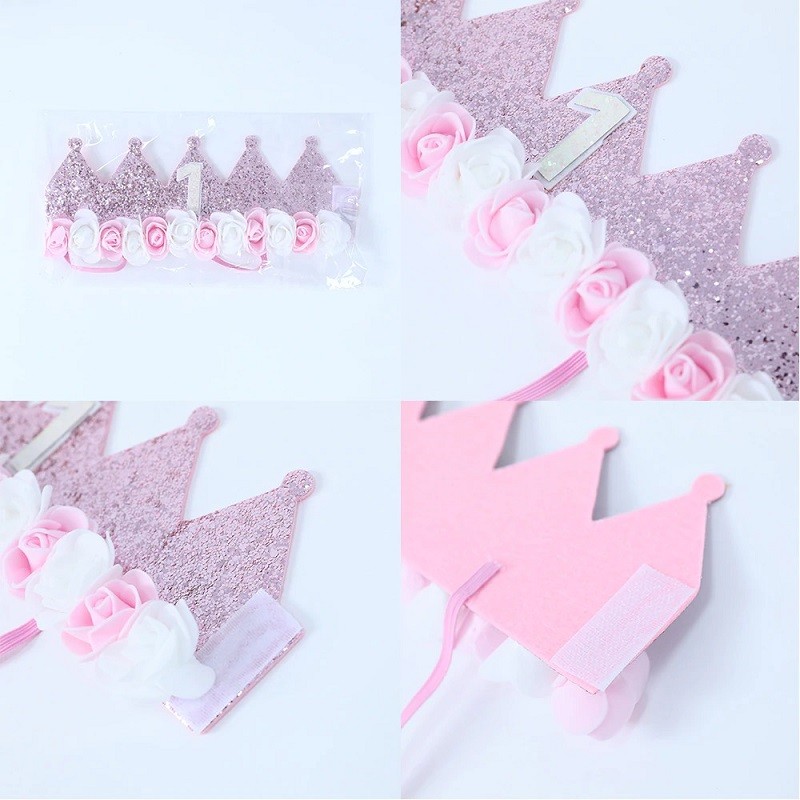The sparkly birthday hat for the first year is equipped with elastic for securing on the head. The hat is shaped like a crown and is decorated with flowers. Get this beautiful hat for your child to celebrate their first birthday.
