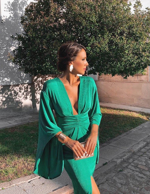 Luxury bodycon dress with flared sleeves and a deep neckline.