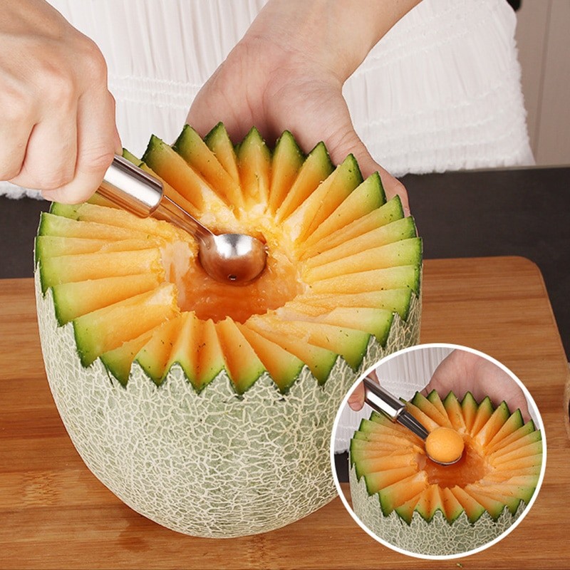 Package contents: 1 pcs scraper, 1 pcs serrated cutter, 1 pcs core cutter, 1 pcs decorative cutter, 1 pcs melon scoop, 1 pcs scoop