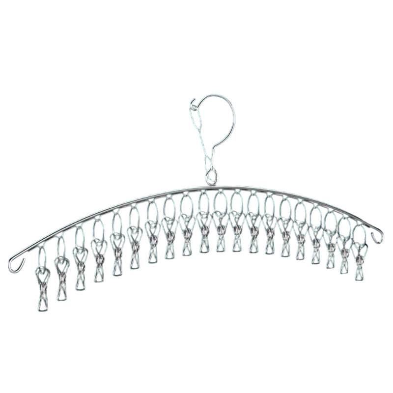 Make drying small laundry easier with this practical stainless steel hanger with 20 pegs. This durable hanger is ideal for drying socks, underwear, handkerchiefs, gloves, or children's clothing. Thanks to its stainless steel construction, it withstands moisture, deformation, and everyday wear. Its compact shape is suitable for both bathroom and balcony or drying rack in the flat. Each peg holds firmly but is also gentle on delicate fabrics.