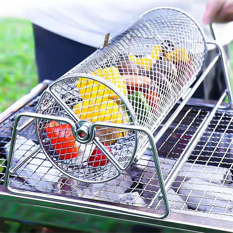Stainless Steel Rolling Barbecue Basket 30 x 13 x 16 cm Rotating Mesh Cylinder for Grilling Vegetables, Meat and Side Dishes Barbecue Basket for Oven and Fire