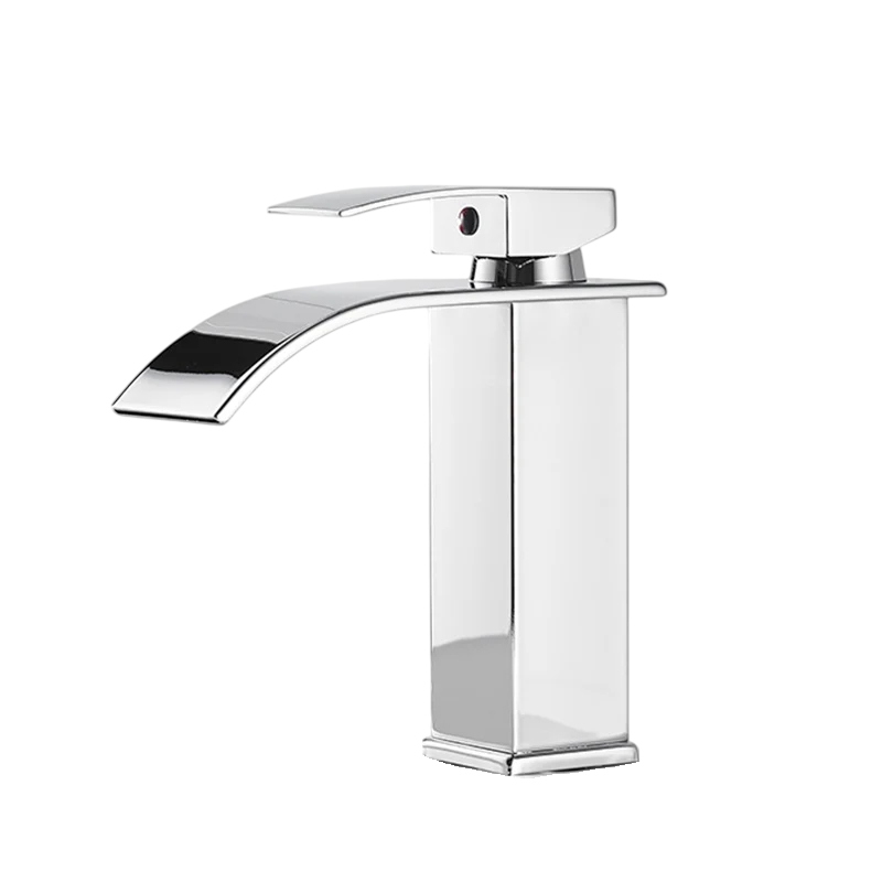 Stylish stainless steel waterfall tap with a short spout allows easy control of hot and cold water, making it suitable for any bathroom. Full description
