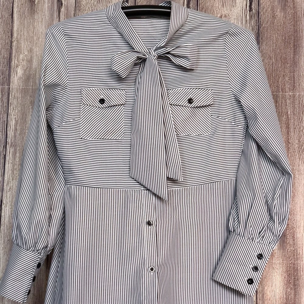 Long shirt-style dress with a tie collar.