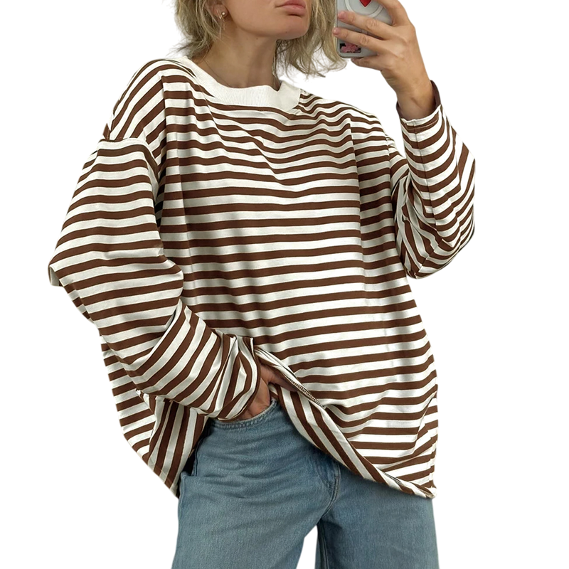 Home page Home page Clothing & Accessories Women’s Clothing Women’s T-Shirts & Tops Women’s Long Sleeve T-Shirts & Tops Striped Oversized Long Sleeve T-Shirt Fashion Loose Fit Casual Streetwear Top Comfortable Wear for Everyday Outfit