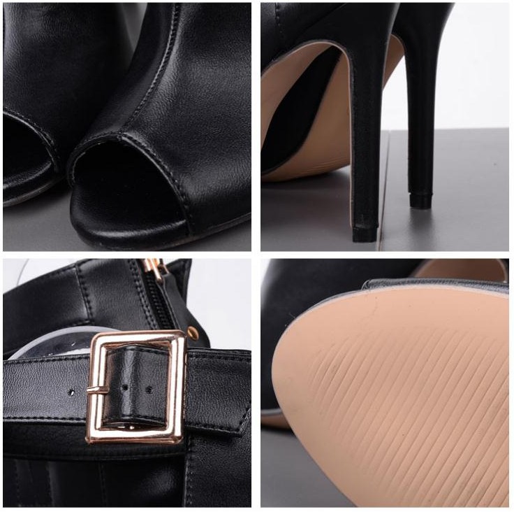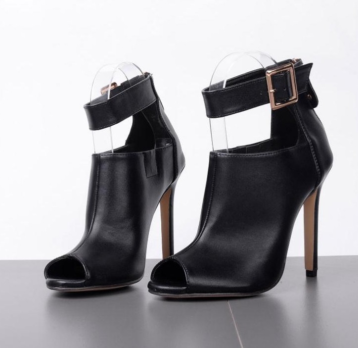 The shoes are in black and fasten with a buckle.