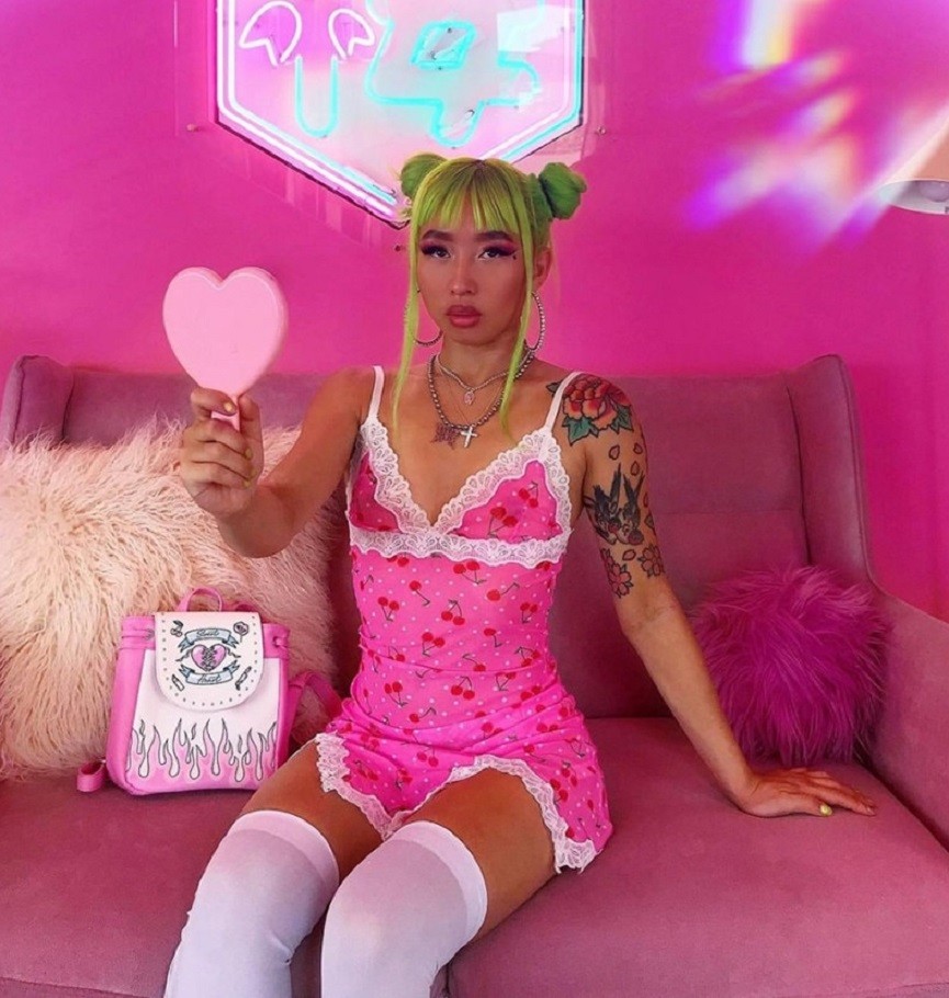 Adorable pink mini dress adorned with white lace.