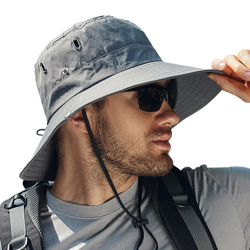 Lightweight summer hat for men with a wide brim and adjustable string, perfect for hiking, gardening, fishing, and travelling. Full description