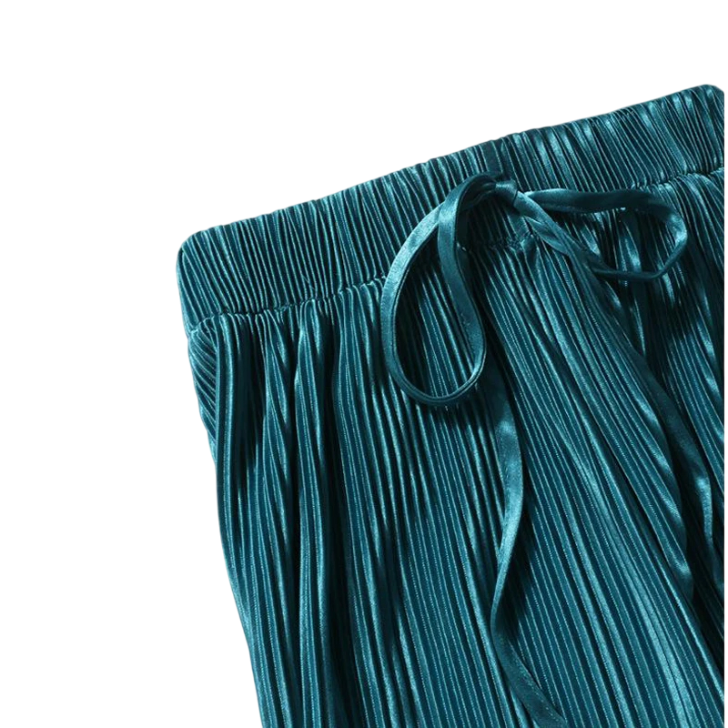 These summer trousers combine practicality and style. The silk-like material is pleasant to the touch and quick-drying, which you will appreciate especially during hot days. The loose fit guarantees freedom of movement, while the pleated effect brings a timeless look. Whether you wear them in the city or at the beach, they will always look great. Thanks to their versatile design and comfortable waist, they are suitable for every body shape.