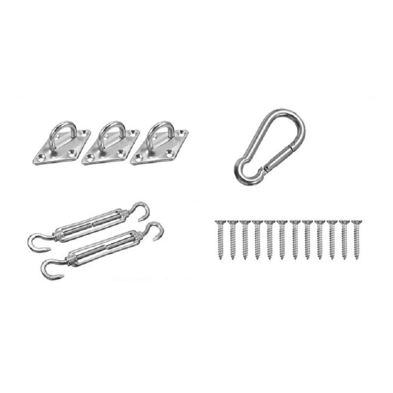 Contents of the package: 12x self-tapping screw, 3x anchor eye M5, 2x tensioner with hook M5 CC, 1x carabiner M5
