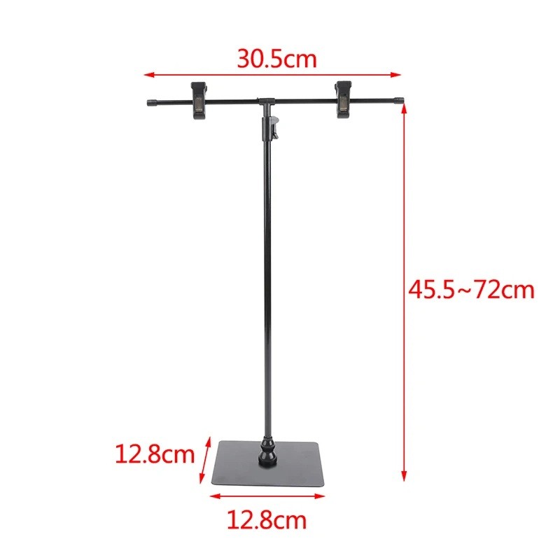 Home page Home page Photo, Audio-Video & Gaming Photography Accessories T-Shaped Background Stand Height 45.5–72 cm Width 30.5 cm Metal Prop Holder Poster Mini Studio Photo Accessories