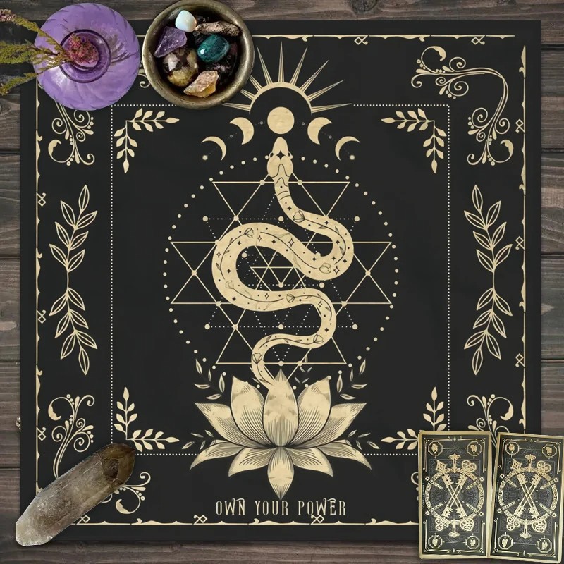 Elegant black tablecloth with tarot motifs and a snake for altars, rituals, and divination. High-quality durable material and striking design for esoteric spaces. Full description