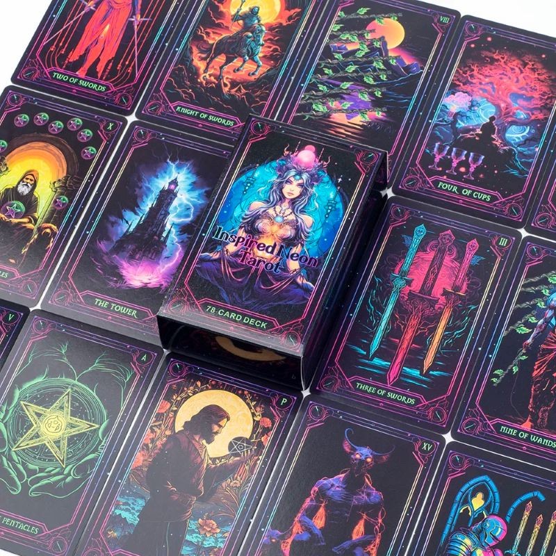 Neon tarot cards with 78 cards in a practical format. Suitable for reading, divination, and working with symbolism and personal development. Full description