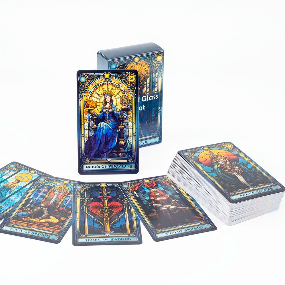 Set of tarot cards with colourful stained glass illustrations in a compact format, ideal for spiritual practice and meditation. Full description