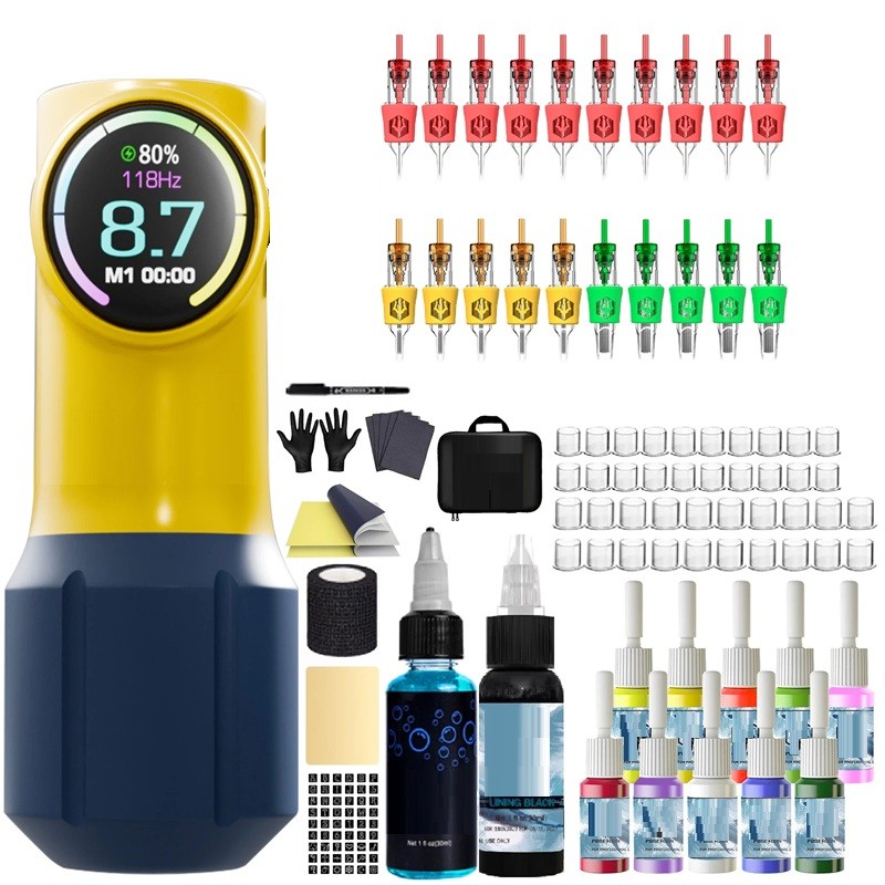 This tattoo kit provides everything needed for professional tattooing at home or in the studio. With wireless operation, a clear LED display, and a wide range of accessories, you will have everything under control and ready for immediate use.