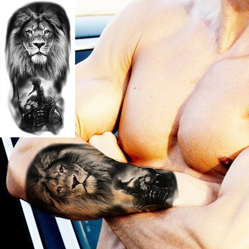 Stylish temporary tattoo featuring a lion and warrior design, waterproof finish, and lasting up to 15 days. Detailed realistic design, easy application. Full description