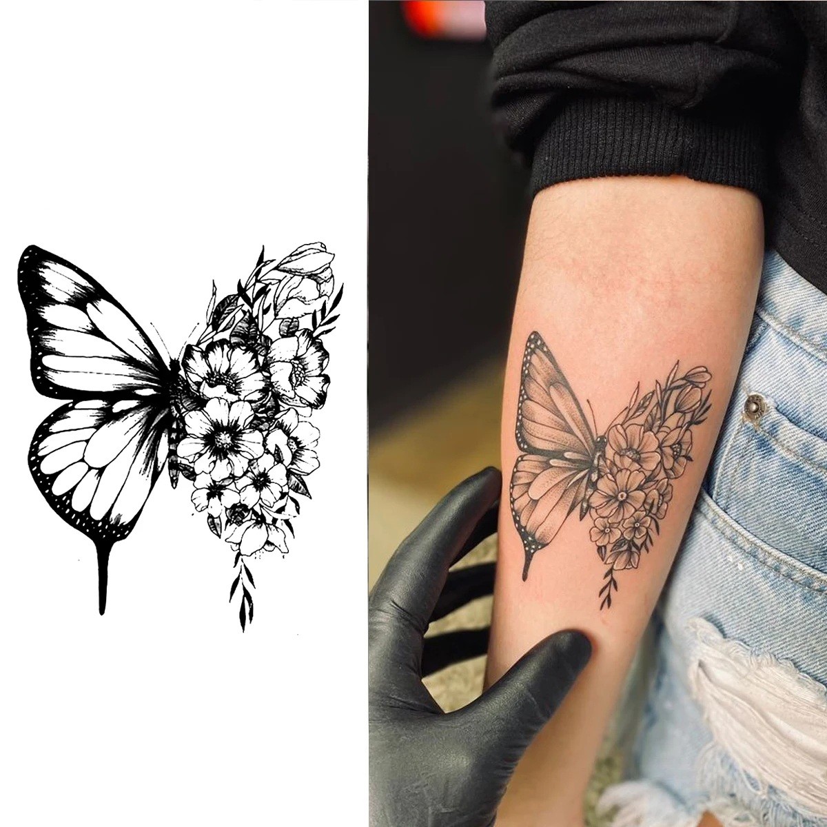 With its delicate design and long-lasting durability, this tattoo perfectly complements any outfit and style. Perfect for festivals, weddings, celebrations, or simply as a romantic accessory to your everyday look. Try the beautiful butterfly and flowers design that will add delicacy and natural charm to your skin!