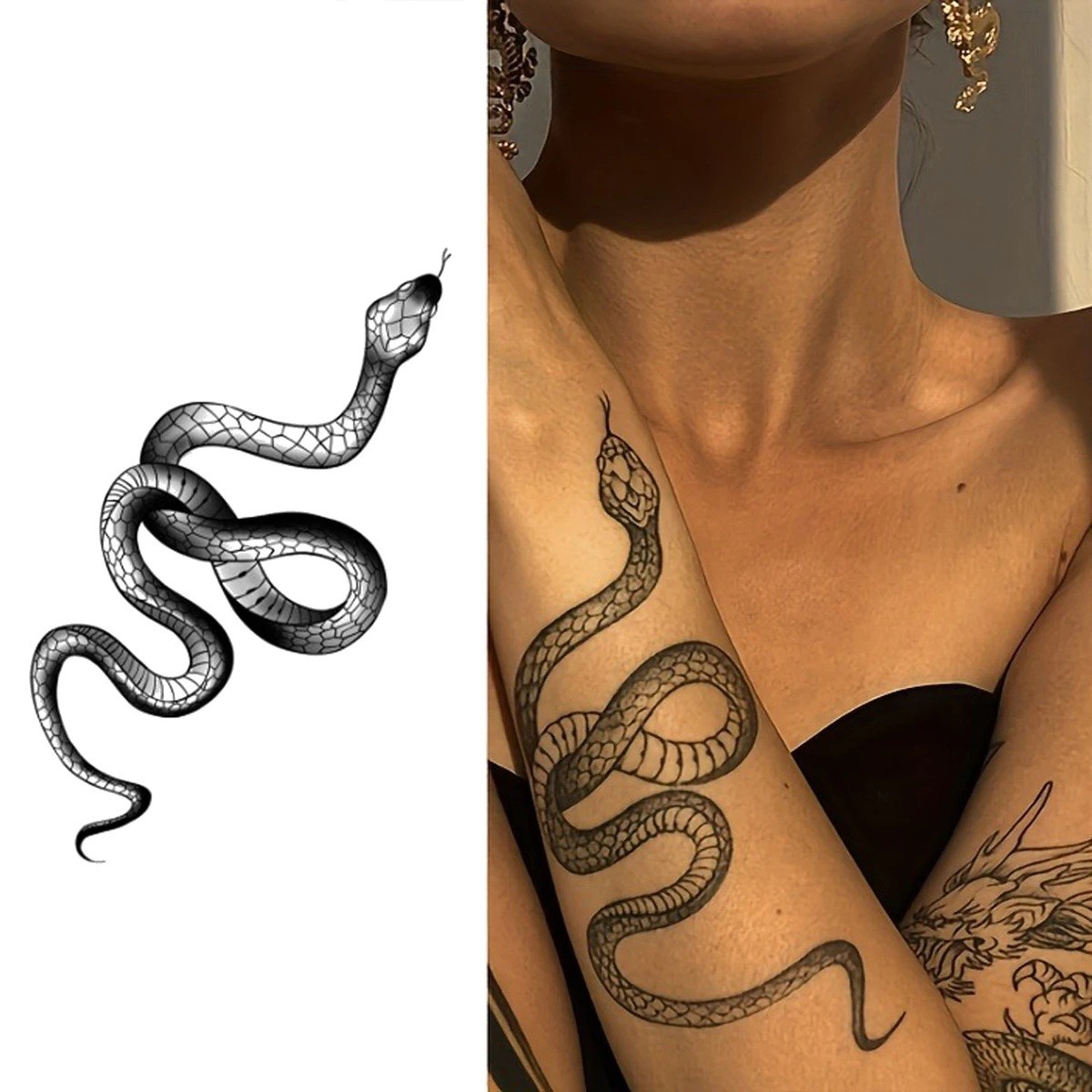 With its realistic design and long-lasting durability, this tattoo is the perfect choice for anyone looking to try an original look without a permanent commitment. Perfect for festivals, parties, cosplay, or just to spice up your style. Try the unique snake design that will highlight your personal style and add a mysterious touch to your appearance!
