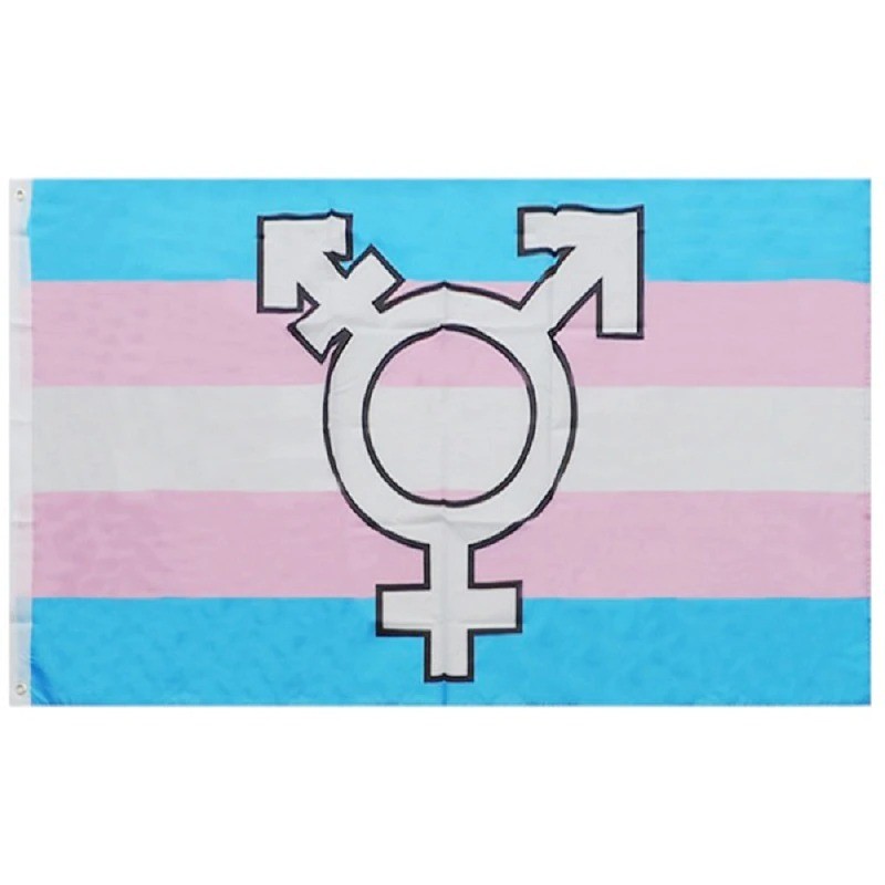 A flag featuring the colours and symbol of transgender pride. It has metal eyelets in the corners. Allows for hanging on a pole or displaying from a window. Durable against damage and fading.