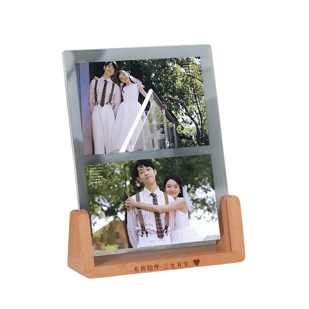Decorative stand for displaying photographs between two acrylic panels. The natural wooden base ensures stability and a modern look for your interior. Full description