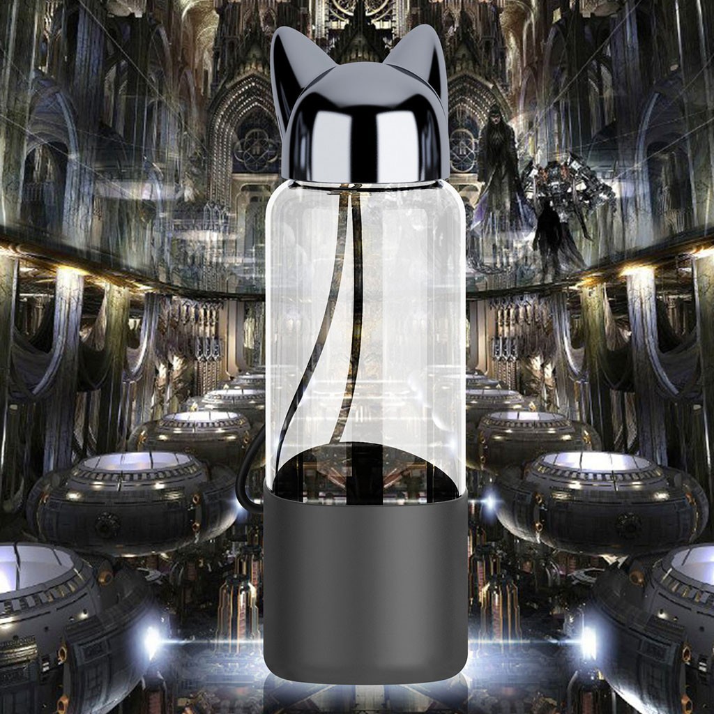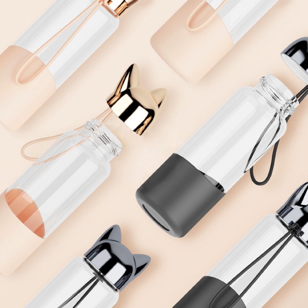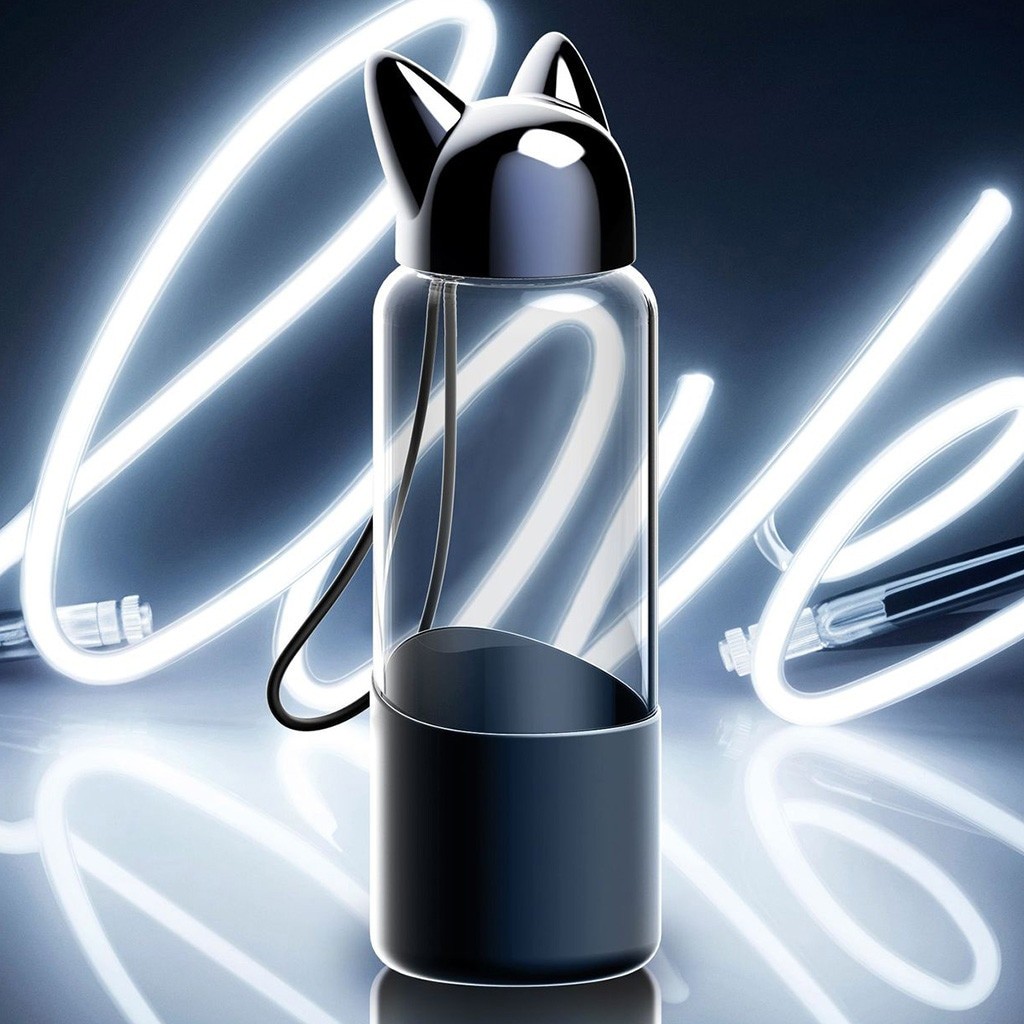 The bottle features a glass body and a stainless steel lid with decorative handles.