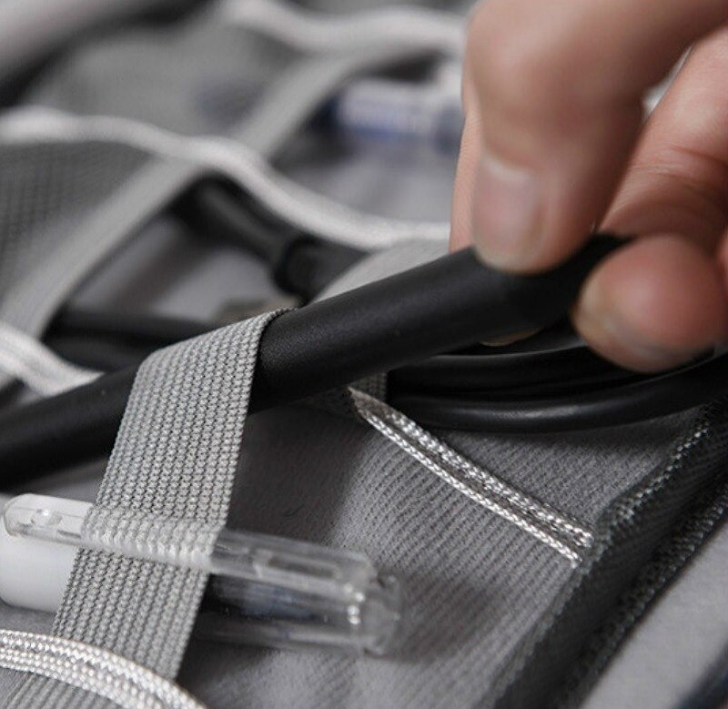 Practical organiser for cables and other electronics. It has 4 compartments and elastic straps in the lid for holding cables. The organiser zips closed. Equipped with a handle for easy transport.