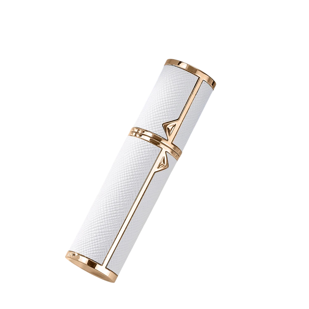 The compact 5 ml perfume atomiser is a practical accessory for daily carrying of your favourite fragrance. Thanks to its smaller dimensions, it can easily be stored in a handbag, pocket, or cosmetic pouch. The combination of PU leather and metal creates a sturdy yet functional design suitable for regular use. The atomiser allows you to carry a smaller amount of perfume without the need to bring the entire bottle. The decorative gold details enhance the overall appearance while also serving as a structural component.
