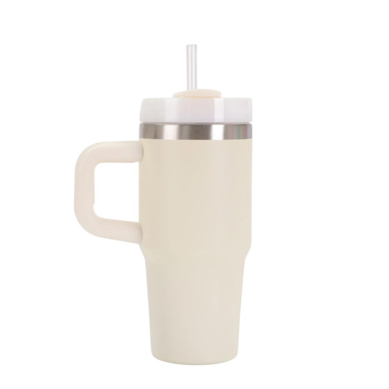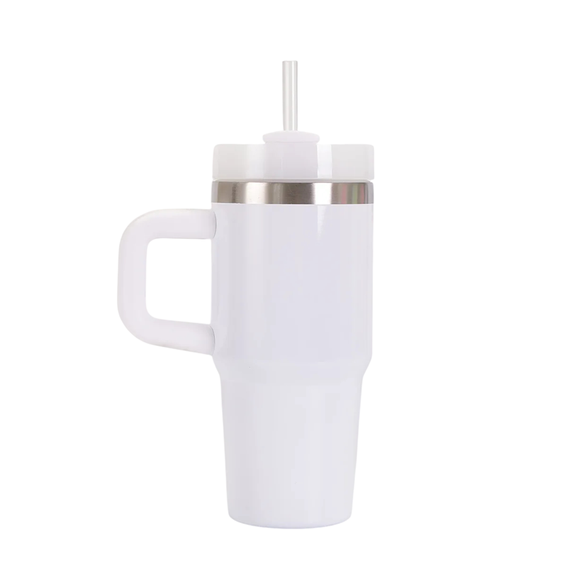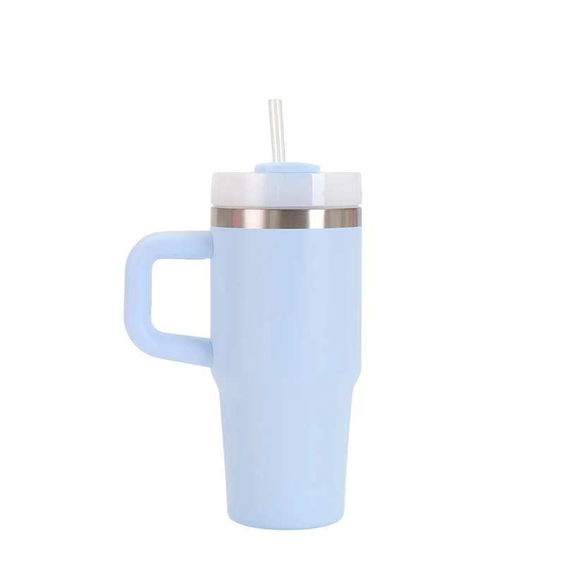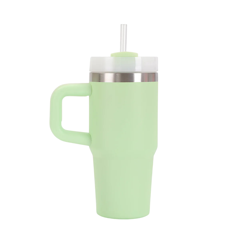 The travel mug combines several practical features – a sealing lid, a straw, and an ergonomic handle. These elements facilitate handling and allow for comfortable use while carrying or during car journeys.