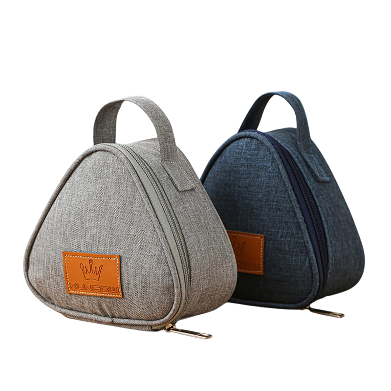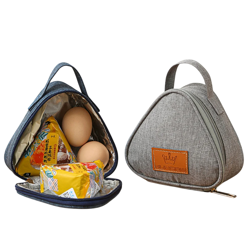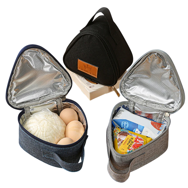 Stylish triangle thermal bag with insulation layer and zip, ideal for small snacks or drinks for school, work, or travel. Full description