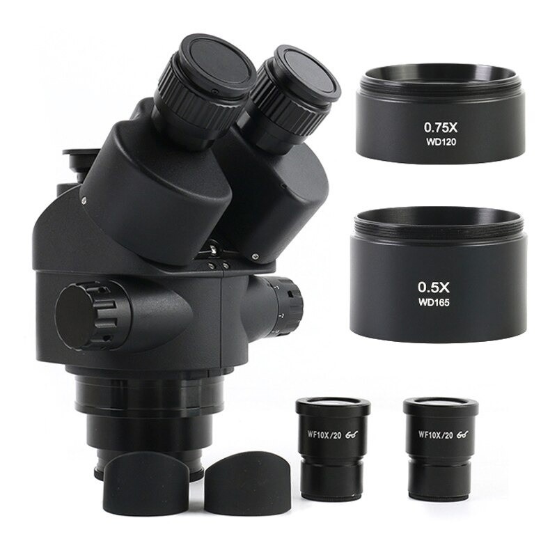 Contents of the package: 1x trinocular microscope, 1x pair of eyepieces, 1x pair of eye guards, 1x dust cover, 1x 0.75x objective, 1x 0.5x objective
