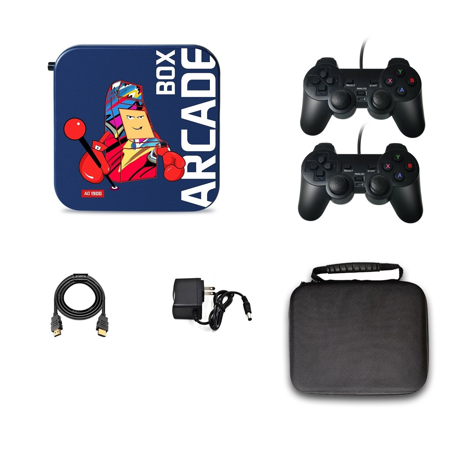 Package contents: 1x console, 2x gaming controller, 1x power adapter, 1x HD cable, 1x microSD card, 1x bag