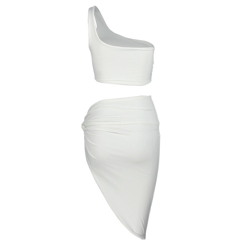 One shoulder top, skirt with a high slit.