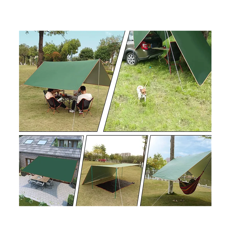 Lightweight outdoor tarp protects against sun and rain. Suitable for 5–8 people. Ideal for hiking, camping, picnics, and the beach. Includes bag. Full description