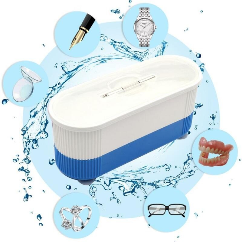 The ultrasonic cleaner is suitable for hygienic cleaning of jewellery, glasses, watches, rings, coins, dentures, and other small items. The power button initiates a five-minute cleaning cycle.